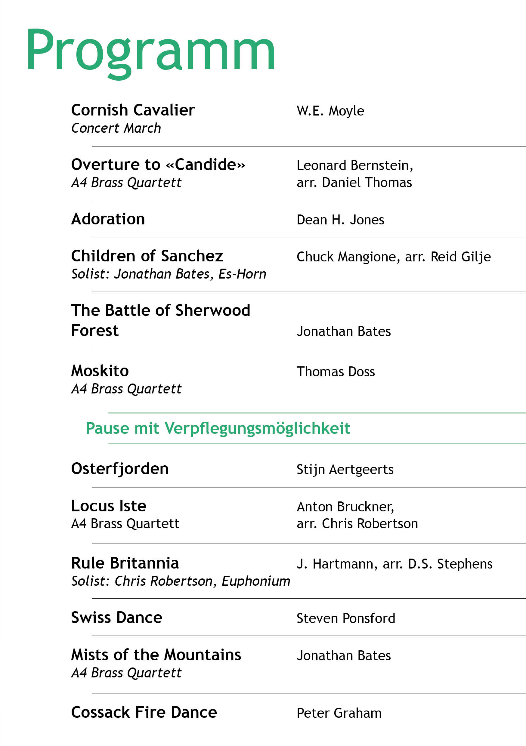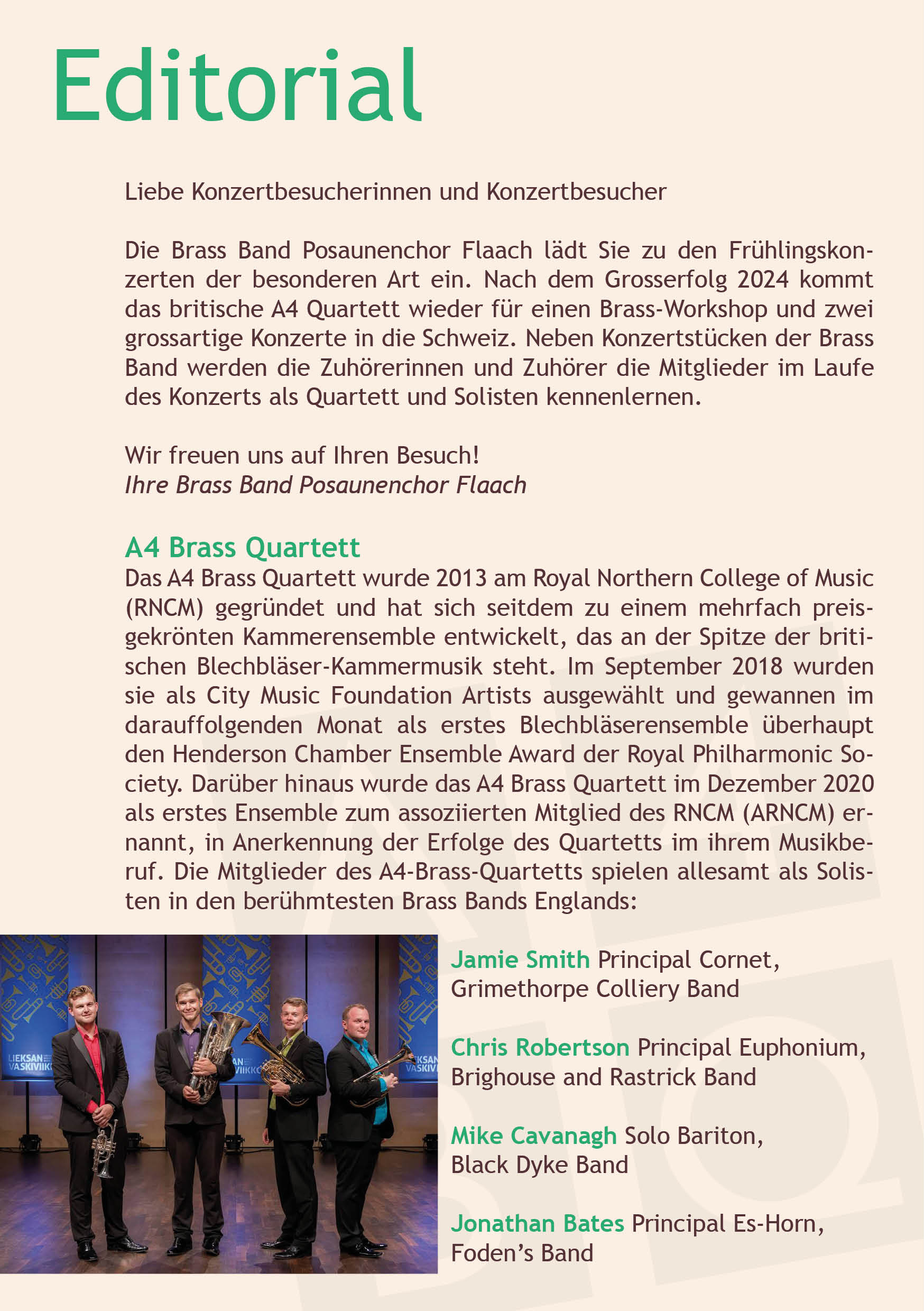 Wir freuen uns sehr, dass wir an unseren beiden Frühlingskonzerten (nach 2024) erneut das A4 Brass Quartett aus England als «special guests» begrüssen dürfen. Dieses Quartett setzt sich aus vier hochkarätigen Musikern zusammen, die alle in berühmten englischen Brass Bands tragende Rollen haben. Die vier Jungs aus England werden Sie (und uns!) auch diemal begeistern.
