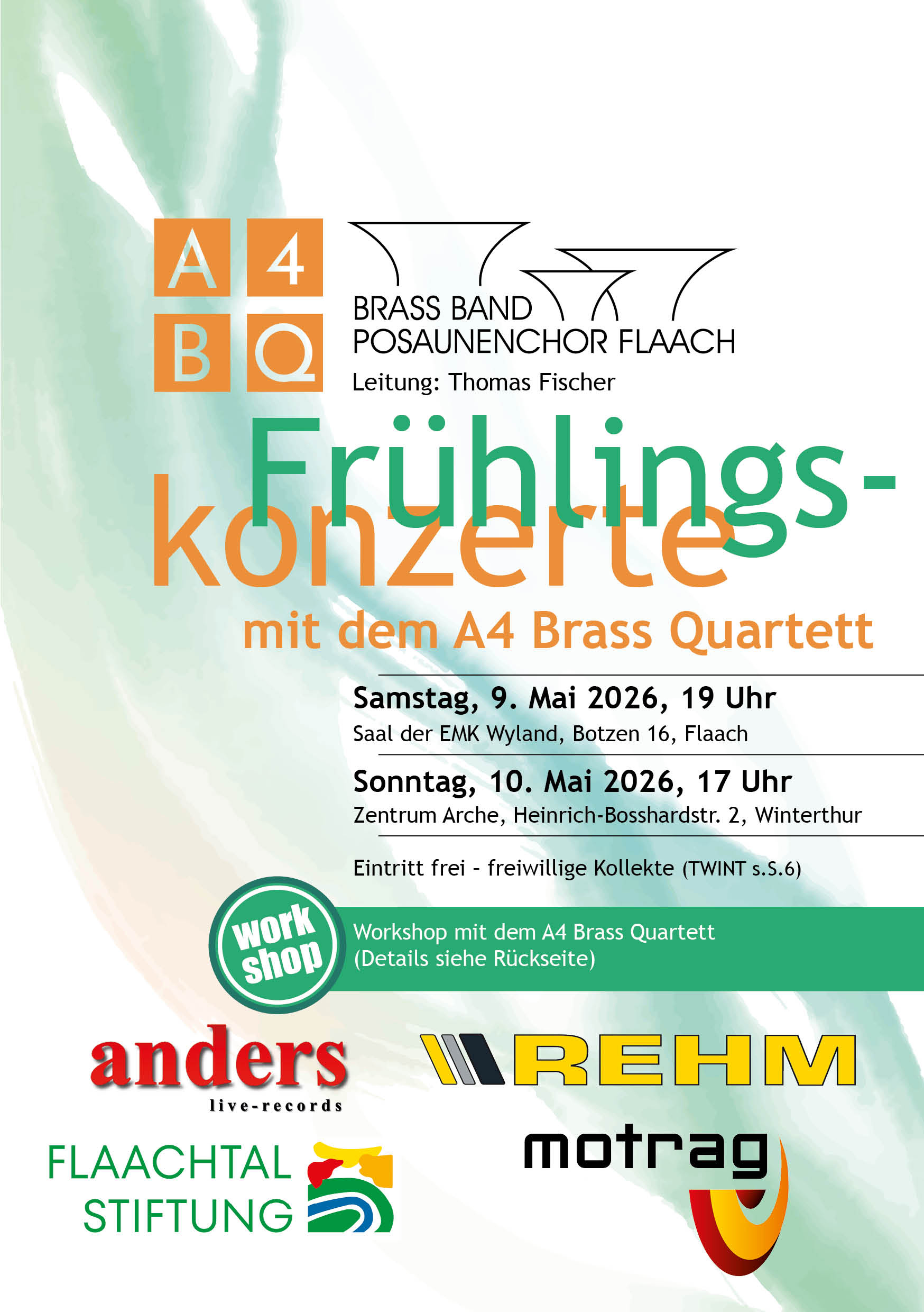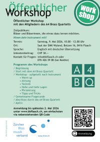 Wir freuen uns sehr, dass wir an unseren beiden Frühlingskonzerten (nach 2024) erneut das A4 Brass Quartett aus England als «special guests» begrüssen dürfen. Dieses Quartett setzt sich aus vier hochkarätigen Musikern zusammen, die alle in berühmten englischen Brass Bands tragende Rollen haben. Die vier Jungs aus England werden Sie (und uns!) auch diemal begeistern.
